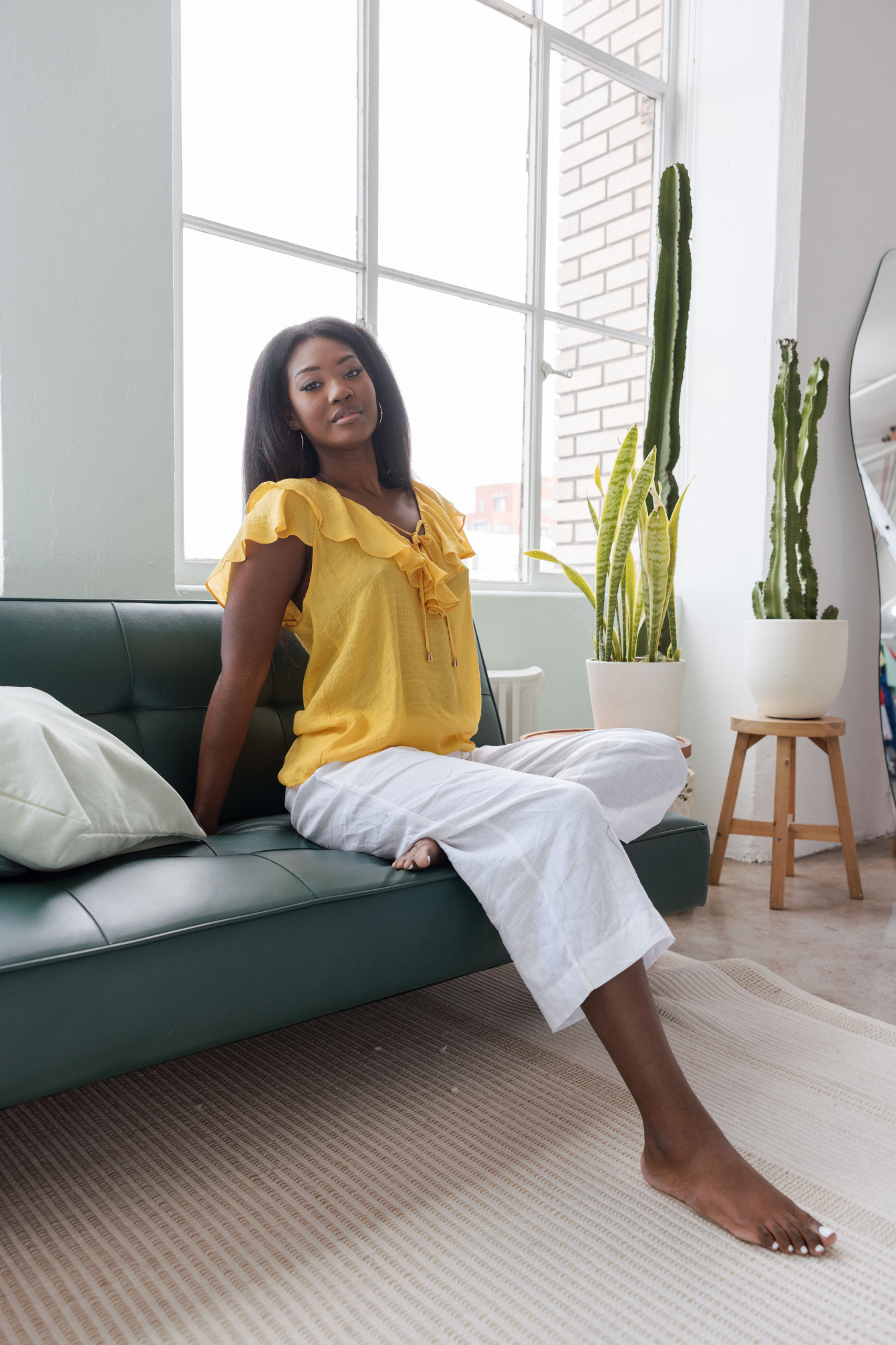 This lightweight and airy blouse is crafted from a breathable blend of rayon and polyester, offering a comfortable drape and soft feel. The blouse features a charming ruffle-trim neckline with a delicate tie-front detail, adding a feminine touch. Flutter sleeves provide a graceful silhouette, while the relaxed fit ensures all-day comfort. Perfect for warm weather or layering, this versatile piece pairs effortlessly with casual or dressy bottoms for a chic, laid-back look.