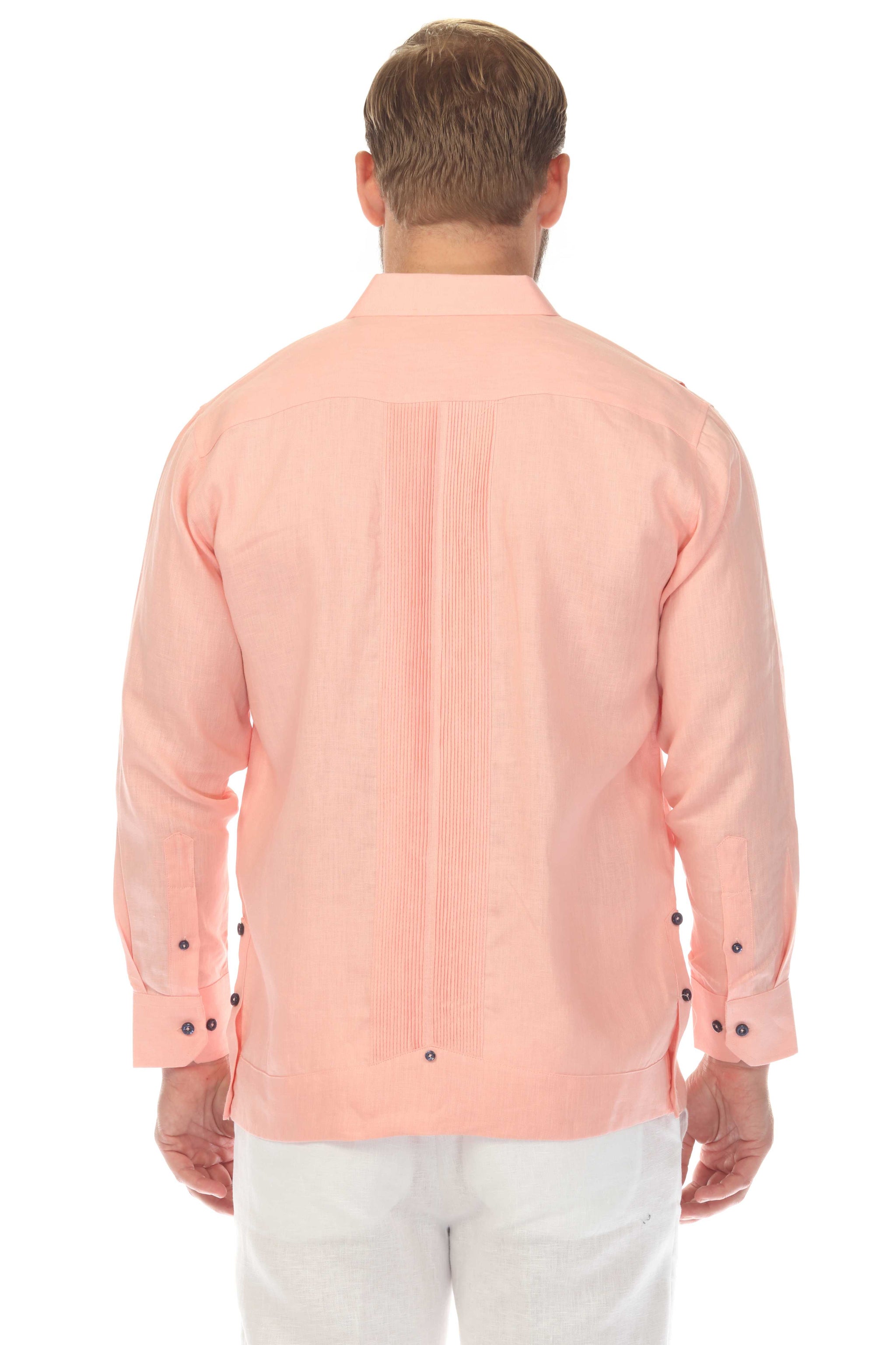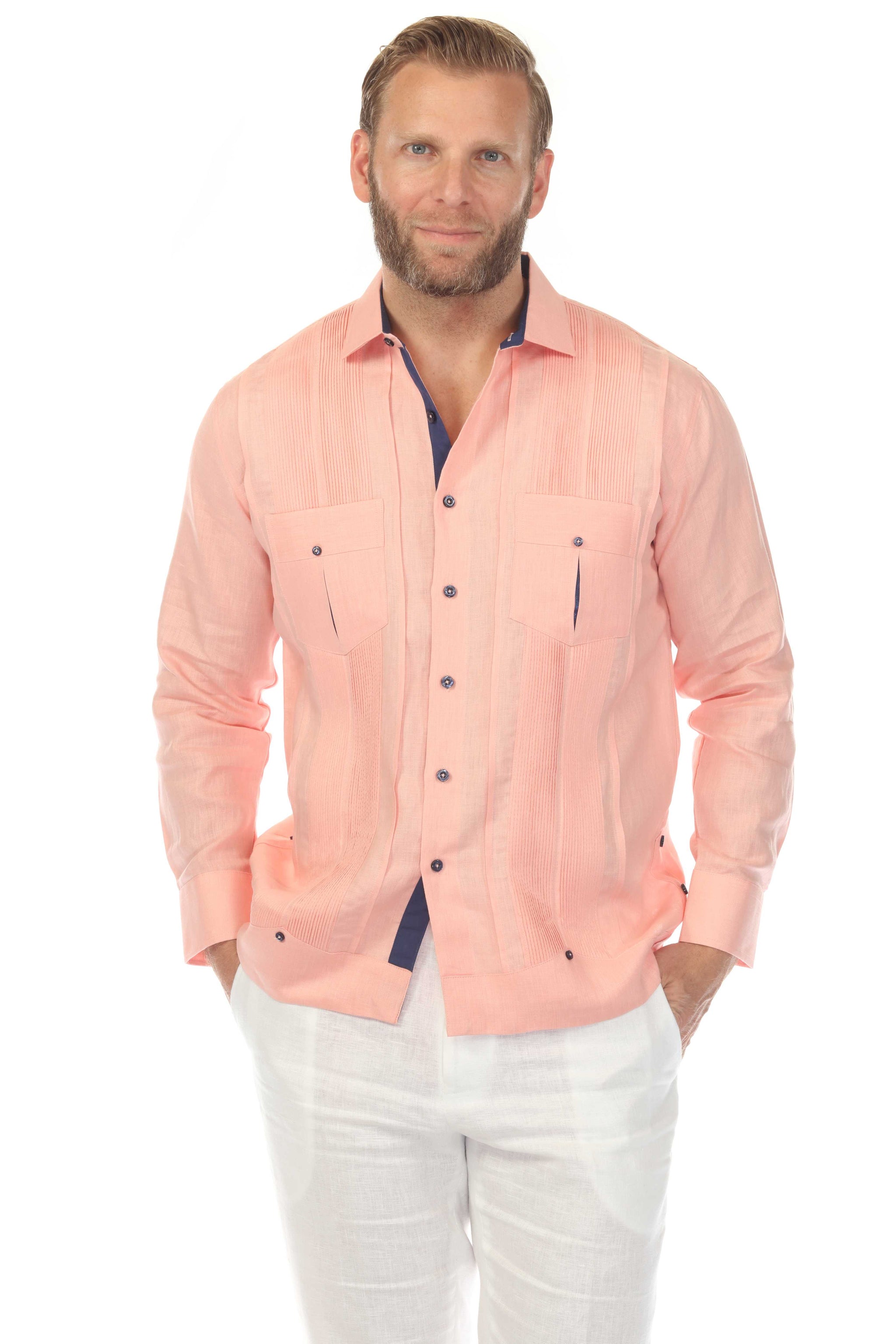 Vibrant yet refined, this long-sleeve Men’s Guayabera is crafted from 100% premium linen and elevated with contrast pocket detailing and handcrafted finishes. Featuring handcrafted chest pockets and a traditional pleated front, this piece blends classic Latin tailoring with modern visual contrast — ideal for weddings, destination events, and polished evenings out.