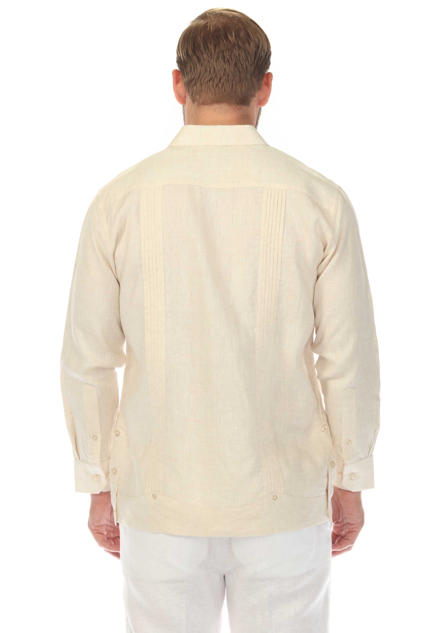 Timeless and breathable, this long-sleeved chacabana is crafted from 100% yarn-dyed linen for a soft, natural feel and elevated texture. Featuring two chest pockets and subtle pleated panels, it offers classic guayabera styling with a clean, modern finish—perfect for everything from warm-weather weddings to everyday refinement.