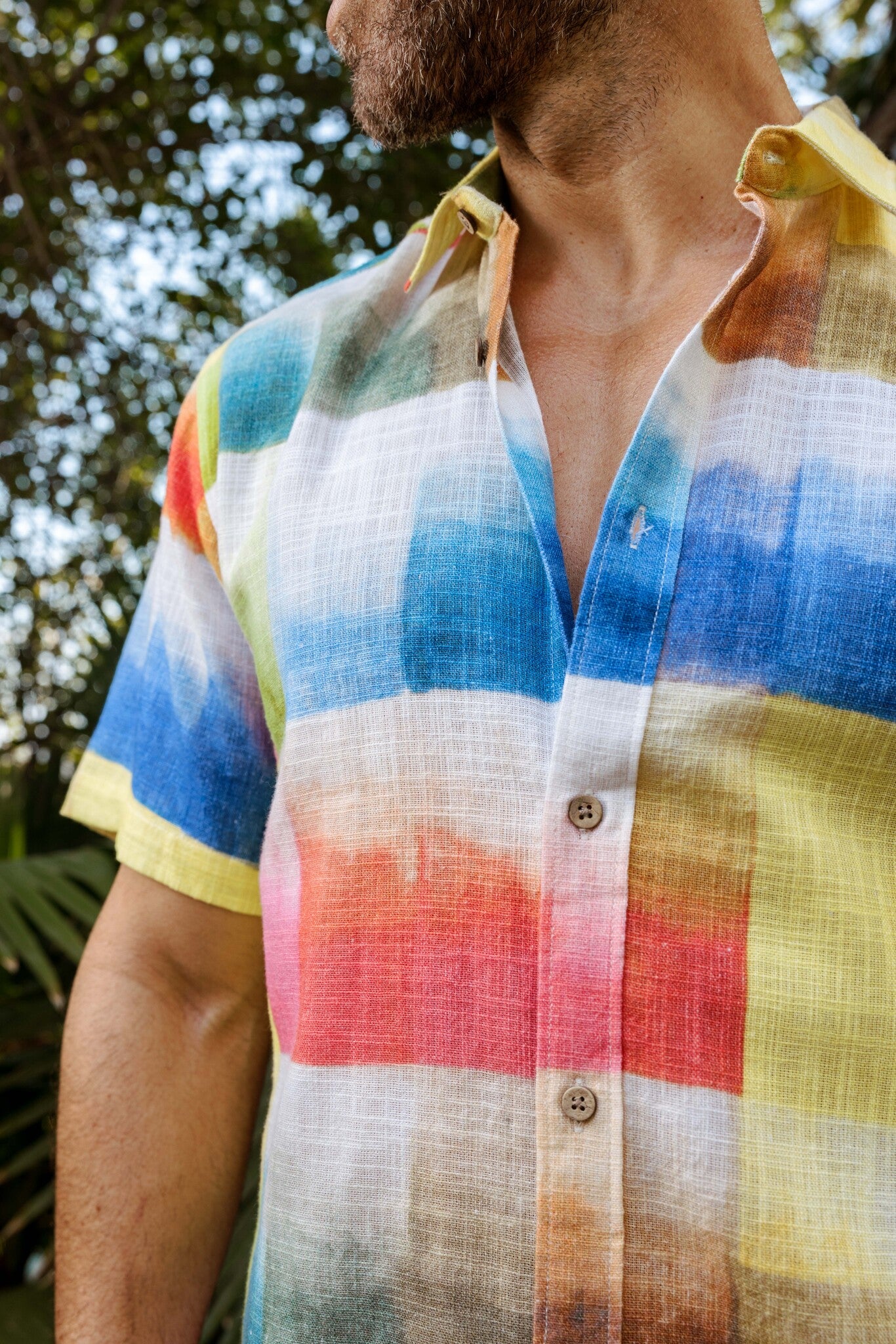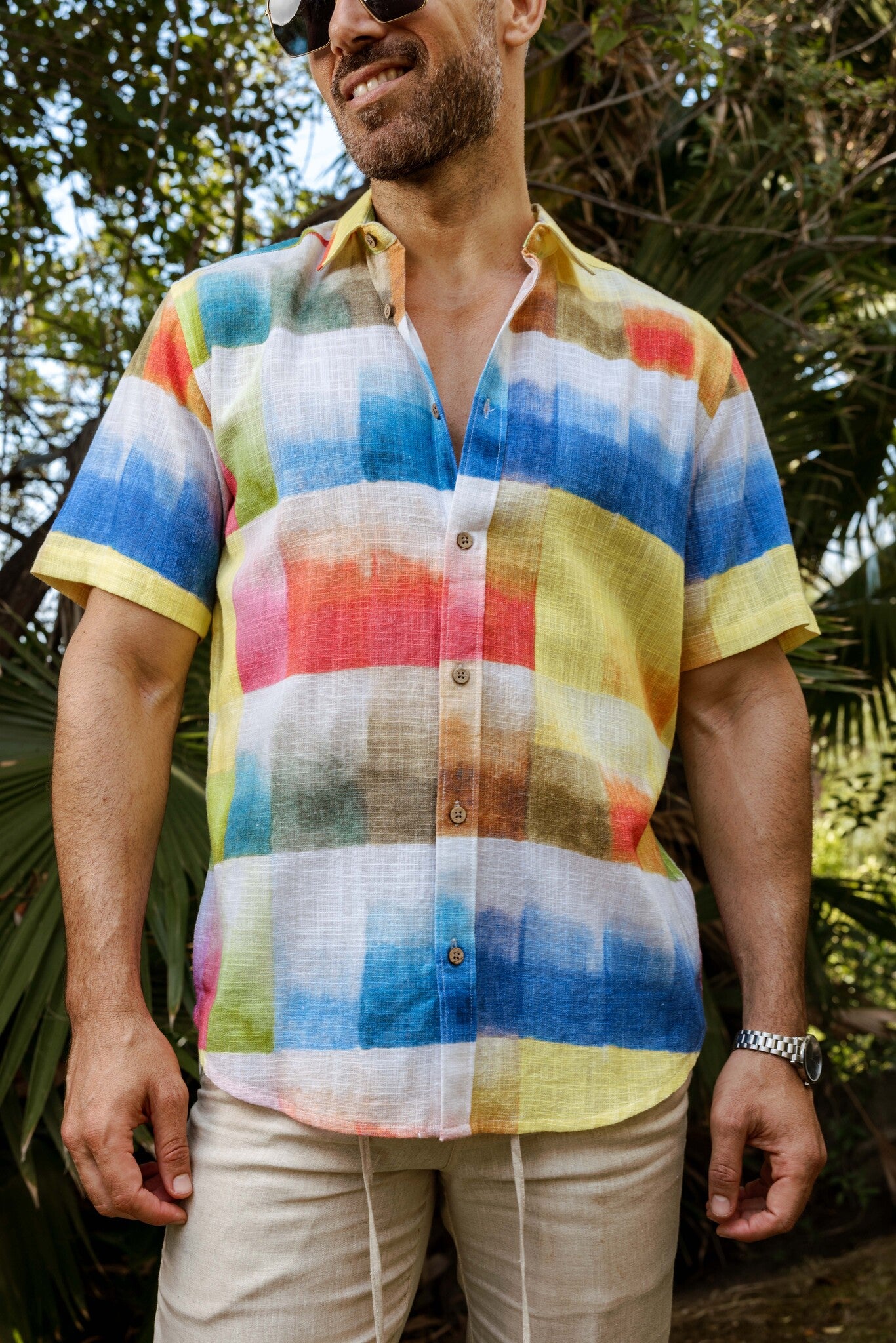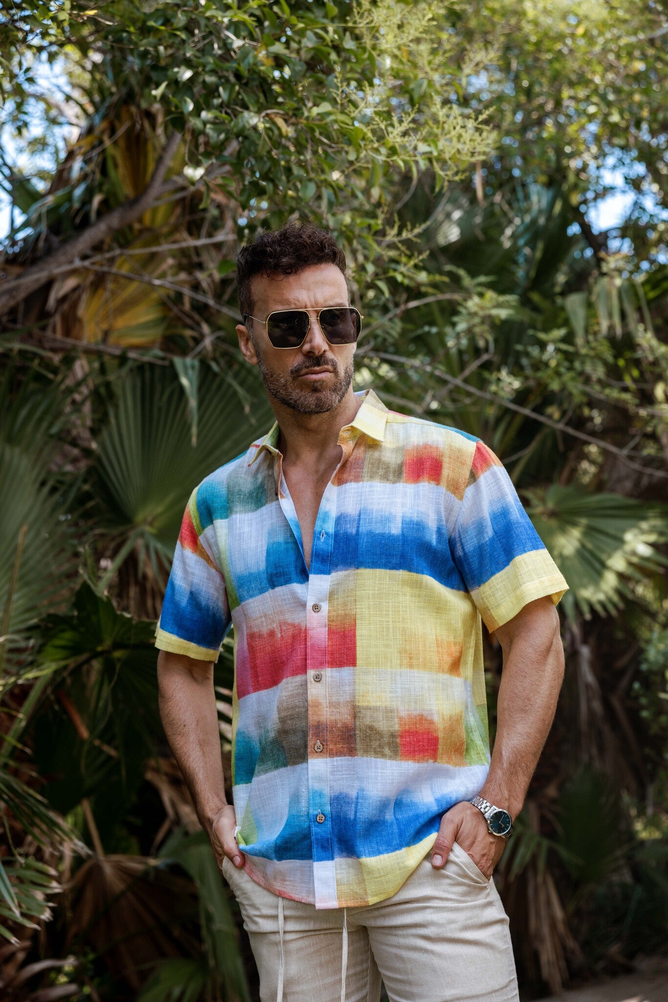 Product Details Elevate your resort style with this short sleeve button-up crafted from a lightweight cotton-linen blend. Featuring a crisp leaf print and a casual rolled sleeve, it's designed for effortless warm-weather refinement.