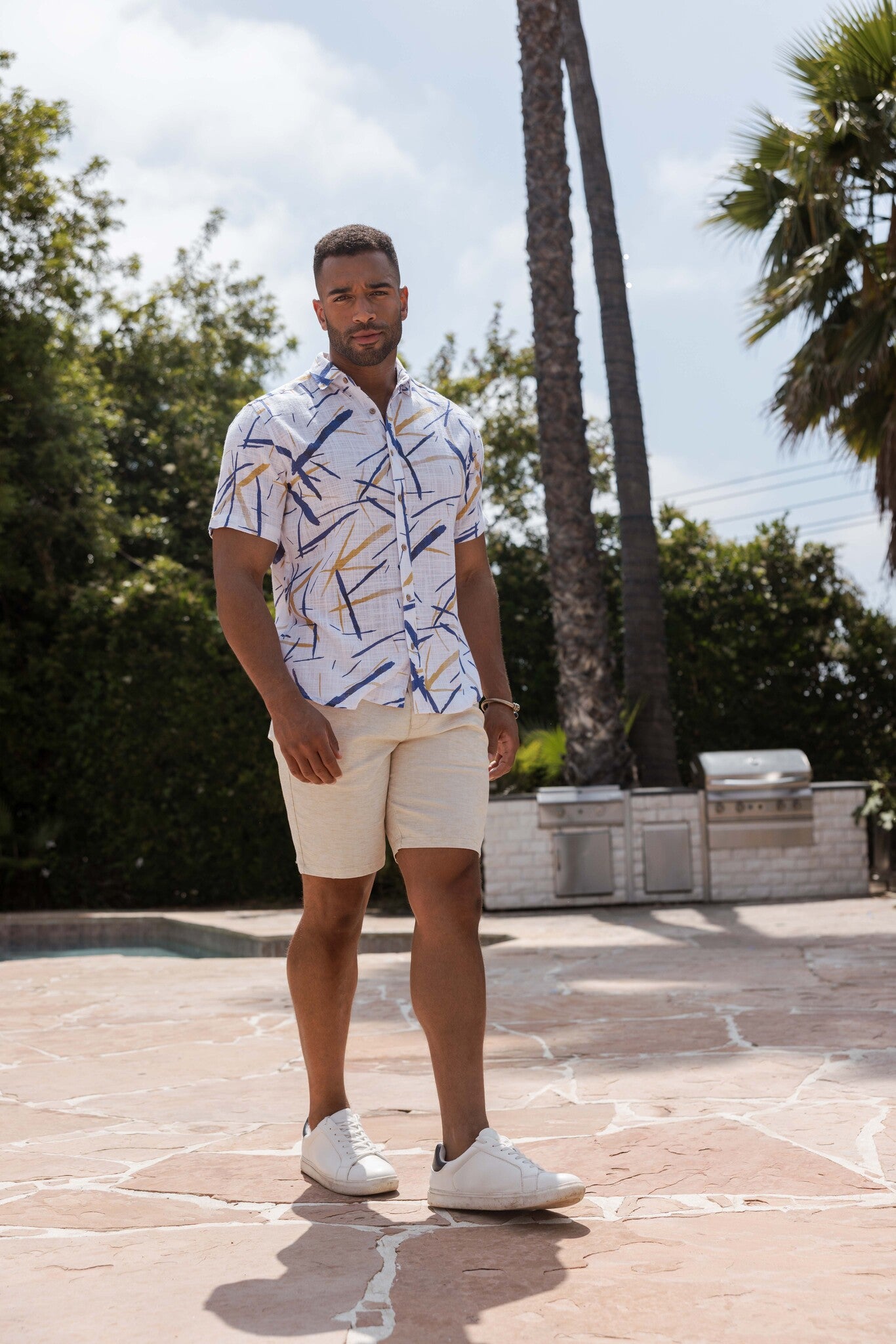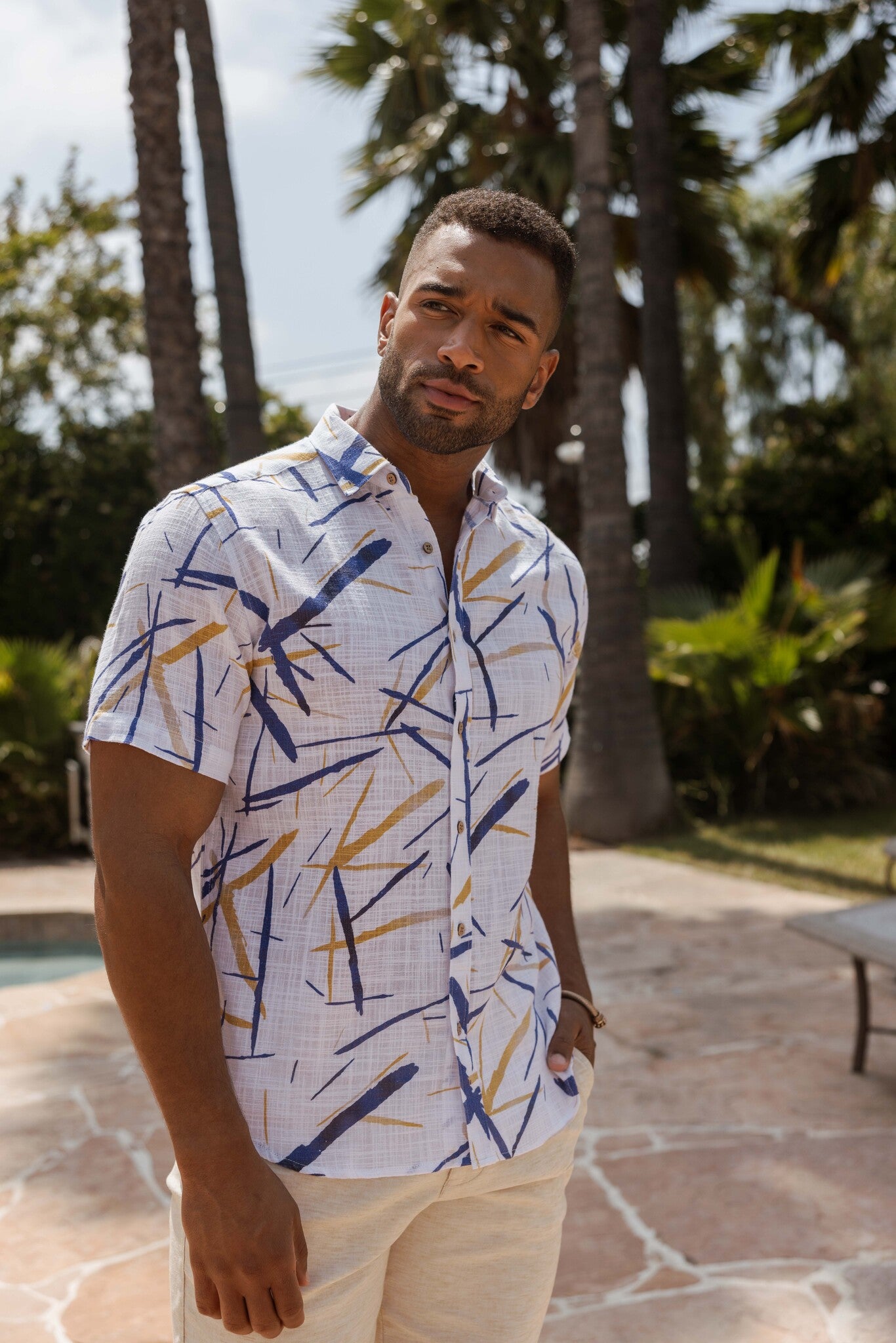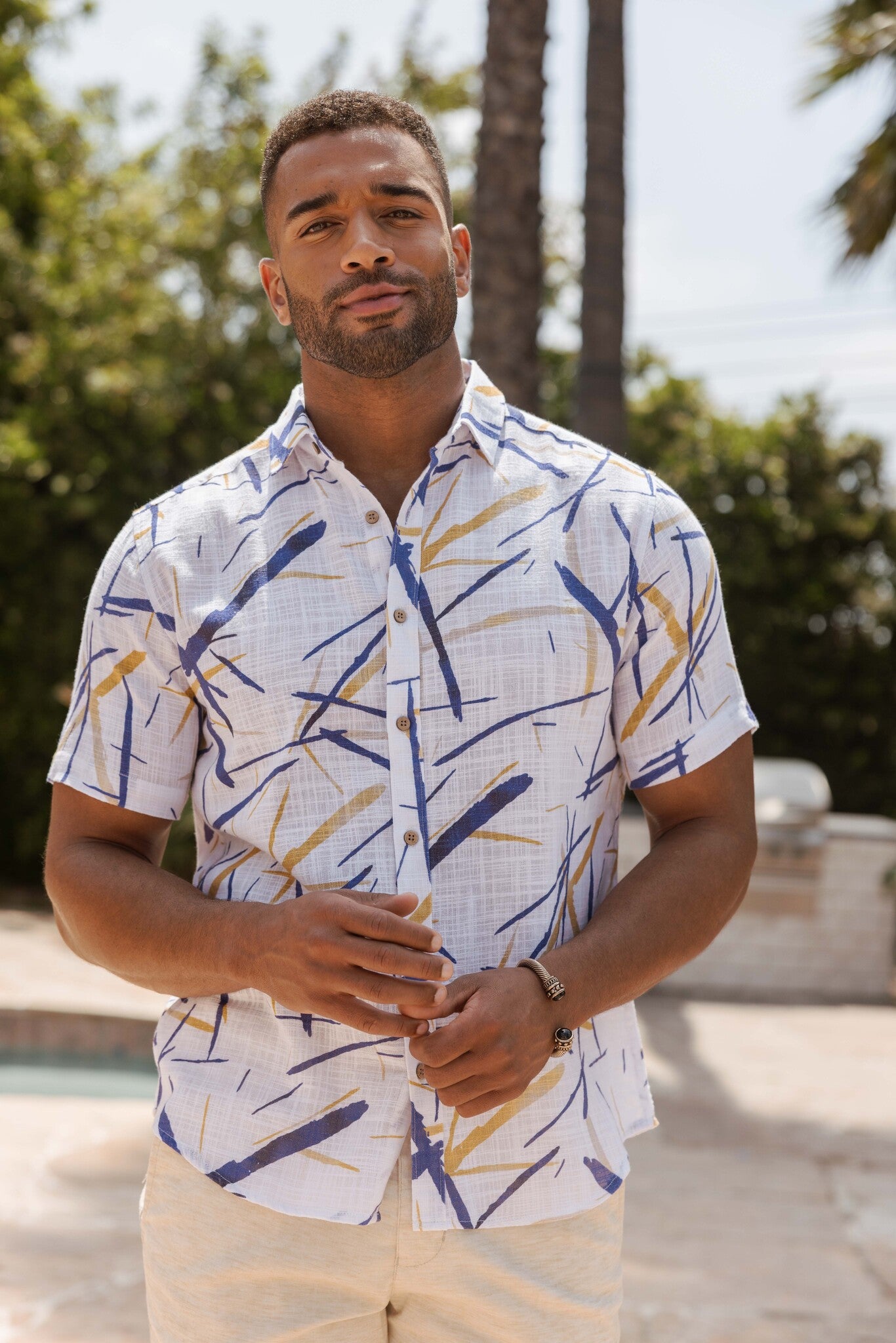 Product Details Elevate your resort style with this short sleeve button-up crafted from a lightweight cotton-linen blend. Featuring a crisp leaf print and a casual rolled sleeve, it's designed for effortless warm-weather refinement.